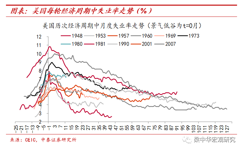 而且从美国历轮经济周期来看,衰退容易复苏难。每一轮美国经济周期中,失业率从最低飙升至最高位往往在一年内完成,而重新回到低点平均需要将近5年时间。也就是说,靠市场自发修复的过程,往往是比较缓慢的,所以美国后续经济复苏的斜率也会比我国慢很多。
