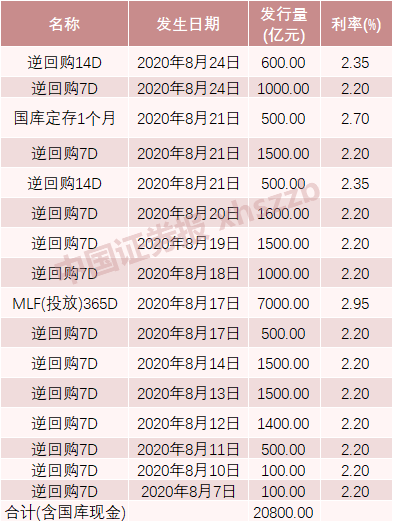 8月21日,央行、财政部还开展了500亿元的今年中央国库现金定存操作,与本月到期规模相同。