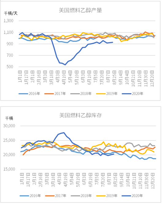 根据美国能源信息署8月19日的报告内容,截止2020年8月14日,美国燃料乙醇的产量为9.26万桶,上周为9.18万桶/每天,产量出现上升;而燃料乙醇的库存为2027.0万桶,上周为1975.0万桶,库存开始上升。但美国疫情尚未结束,出行需求难以完全恢复,限制了乙醇生产。后续燃料乙醇大概率仍然维持目前的生产水准。