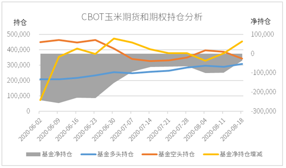 CFTC的持仓数据显示,截至8月18日的一周,CFTC管理基金在CBOT玉米合约的多单为188,672手,增加11,914手;空单为299,171手,减少49,948手。总体净空单110,499手。