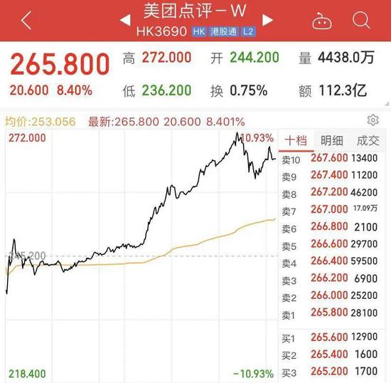 美团点评涨8.40%,盘中高见272港元,市值突破2000亿美元,成为港股目前第五大市值公司,仅次于阿里、腾讯、工商银行、中国平安。