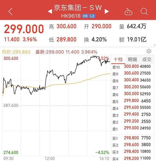 京东涨3.96%,盘中高见300.6港元,创新高。