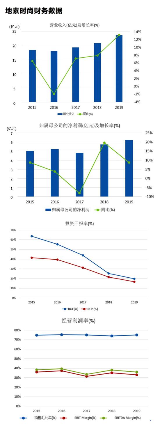 地素时尚上市后依旧表现不俗,根据公司2019年年报, 2019年度营业收入约23.78亿元,较上年同期增加近10%;净利润6.24亿元,较上年同期增加8.75%;ROE仍高达19.73%。地素时尚的净利润率一直处于行业领先地位,毛利润率更是连续六年在女装企业中保持领先。