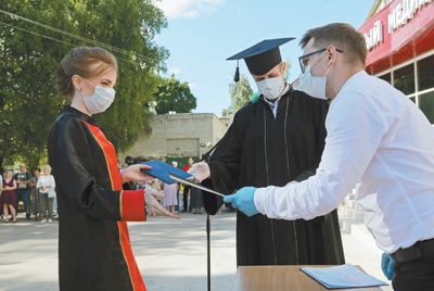 6月30日,在俄罗斯梁赞国立医科大学毕业典礼上,一名毕业生正接过毕业证书。
