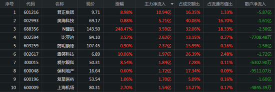 从个股来看,主力资金最青睐的3只股票分别是君正集团、奥海科技、N键凯,流入金额分别为10.94亿元、5.21亿元、3.59亿元,所对应的涨幅分别为8.98%、0.88%、248.47%。