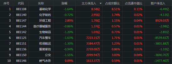 主力资金主要基础化学、化学制药、环保工程三个板块,流入金额分别为8.58亿元、2.95亿元、1.76亿元,其中散户净流入金额为-6.49元、-4.13亿元、0.89亿元。三个板块的涨幅分别为1.64%、0.72%、2.89%。