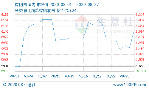 月初,豆油市场均价6416元/吨,月末,豆油市场均价6693元/吨,价格上涨4.31%。月初,棕榈油市场均价5934元/吨,月末,棕榈油市场均价6112元/吨,价格上涨3%。