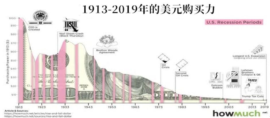 数据显示,在过去的一个多世纪,美元的购买能力是明显持续下跌的,也就是说,美元越来越不值钱了。而在几个世纪以来,黄金一直都展现出良好的价值储存功能,这使其与通胀的法定货币区别开来。