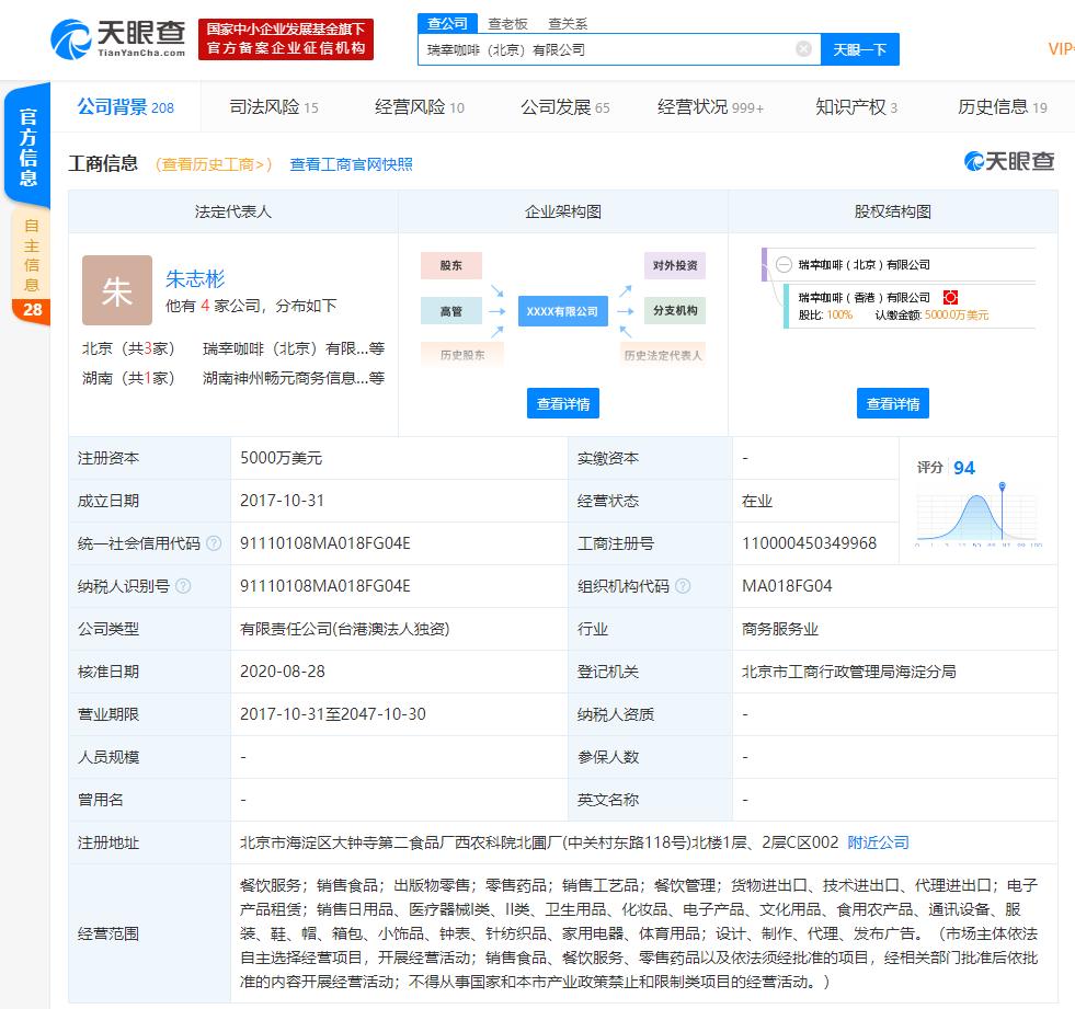 天眼查APP显示,瑞幸咖啡(北京)有限公司成立于2017年10月,注册资本5000万美元,经营范围包括餐饮服务;销售食品;出版物零售;零售药品;销售工艺品;餐饮管理等,由瑞幸咖啡(香港)有限公司100%持股。