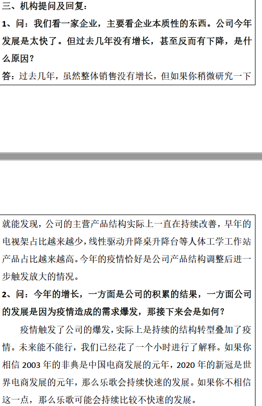 答:过去几年,虽然整体销售没有增长,但如果你稍微研究一下就能发现,公司的主营产品结构实际上一直在持续改善,早年的电视架占比越来越少,线性驱动升降桌升降台等人体工学工作站产品占比越来越高。今年的疫情恰好是公司产品结构调整后进一步触发放大的情况。
