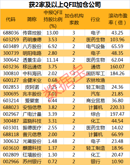 QFII增持股中,透景生命、传音控股、八方股份、创源文化、海尔生物和蒙娜丽莎的增持比例最高。其中传音控股新进3家QFII,透景生命、八方股份、药明康德和明阳电路均获2家QFII增持。从增持个股的行业分布上看,医药生物和电子行业个股居多,分别有13家、11家。