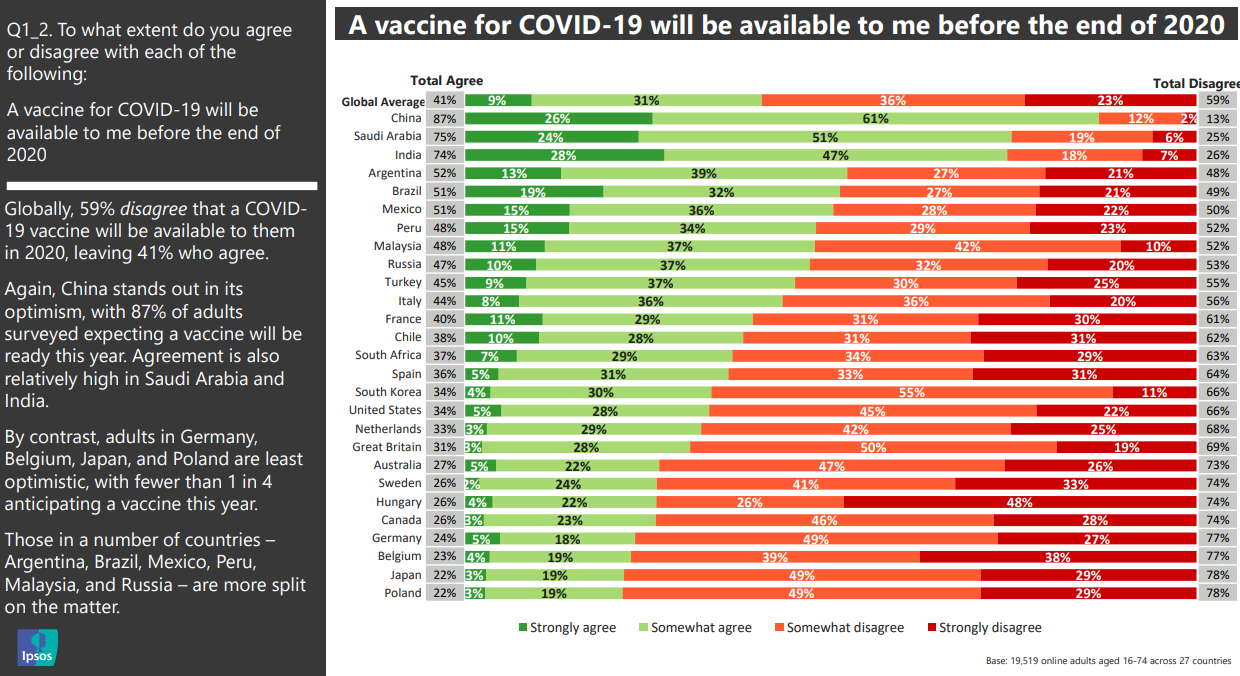 相比之下,德国、比利时、日本和波兰的受访者则持怀疑态度。在这些国家,仅有不到四分之一的受访者同意“我能在2020年年底获得新冠疫苗”这一观点,而美国也仅有34%的受访者表示同意。
