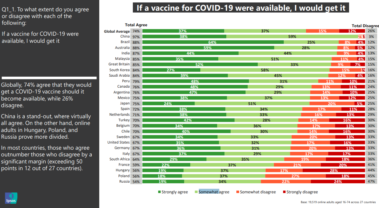 益普索对来自全球27国的近20000名受访者进行了访问。根据该机构9月1日发布的民调结果,关于接种新冠疫情这一问题,全球范围内,74%的受访者表示,如果疫苗面市,他们愿意接种疫苗。在愿意接种新冠疫苗的受访者中,非常愿意和有点愿意的受访者各自占37%。另外26%的受访者表示,如果疫苗面市,他们不愿接种疫苗。
