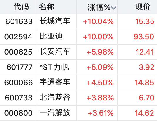 今日A股盘面上,汽车股也涨势不俗,截至收盘,长城汽车、比亚迪涨停,长安汽车、*ST力帆涨超5%,宇通客车、北汽蓝谷等多股均有不同程度的拉升。
