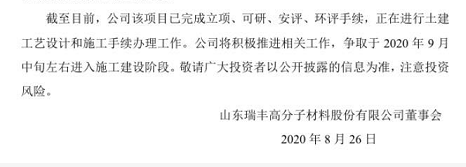 8月25日晚间,瑞丰高材公告,8月24日,公司收到淄博市生态环境局出具的审批意见,同意年产6万吨生物可降解高分子材料PBAT项目,按申报工艺、规模、地点和污染防治措施等进行建设。瑞丰高材表示,公司将积极推进相关工作,争取于2020年9月中旬左右进入施工建设阶段。