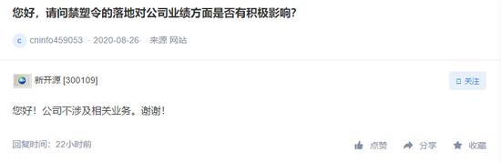 8月31日,新开源回复投资者提问称,“禁塑令”落地对公司业绩无影响,公司不涉及相关业务。
