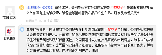 仙鹤股份则表示,针对国家最新“禁塑令”,公司正积极推进纸质绿色包装材料产品。