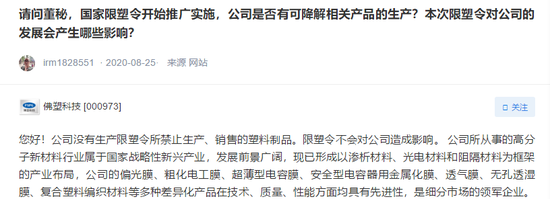 佛塑科技也回复投资者称,公司没有生产限塑令所禁止生产、销售的塑料制品。限塑令不会对公司造成影响。