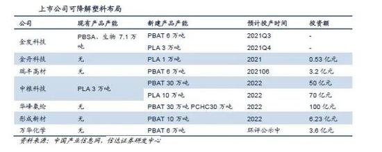 据华安证券统计,目前已有36家公司有在建或拟建的可降解塑料项目,新增产能合计440.5 万吨,是现有产能的7倍。以下表格是部分上市公司对可降解塑料产能的布局情况: