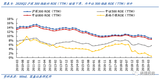沪深300指数2020Q2的ROE(TTM)为8.9%,较2020Q1的9.3%下降0.4个百分点;中证500指数2020Q2的ROE(TTM)为5.6%,较2020Q1的5.0%提升0.6个百分点;中证800指数2020Q2的ROE(TTM)为8.4%,较2020Q1的8.7%下降0.3个百分点;除中证800以外的长尾小盘股2020Q2的ROE(TTM)为0.5%,较2020Q1的1.2%下降0.7个百分点。