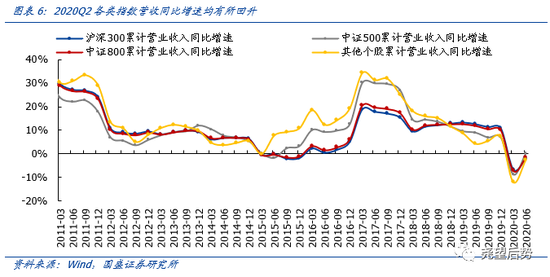 创业板整体2020Q2的营收同比为-0.2%,较2020Q1的-11.3%提升11.1个百分点;创业板剔除温氏股份、乐视网、宁德时代、坚瑞沃能以及光线传媒的2020Q2的营收同比为-0.7%,较2020Q1的-12.9%提升12.3个百分点。