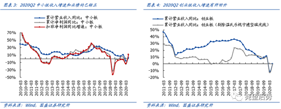 ——中小板整体2020Q2的净利润同比为9.2%,较2020Q1的-15.2%提升24.4个百分点;创业板(剔除温氏乐视网宁德坚瑞光线)的2020Q2的营收同比为-0.7%,较2020Q1的-12.9%提升12.3个百分点。整体来看,中小创的业绩修复力度大于主板,虽然全A非金融的业绩增速仍为负,但中小创已经转正,中小创相对主板仍有业绩优势。
