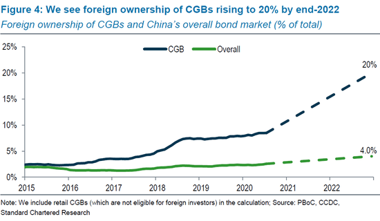 该报告认为,纳入完成后,中国国债的外资持有占比有望增长6%-7%,到2022年底,中国国债中的外资持有占比有望从当前的8.5%升至20%。