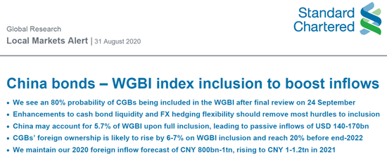 渣打中国最新发布报告称,9月24日,富时罗素将公布其WGBI年度评估结果。渣打认为,中国国债有80%的可能性会被纳入该指数。