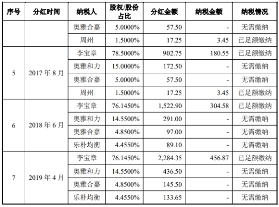 2017年至2019年,奥雅设计现金分红分别为1150.00万元、2000.00万元、3000.00万元。其中,控股股东李宝章获得分红金额分别为902.75万元、1522.90万元、2284.35万元。