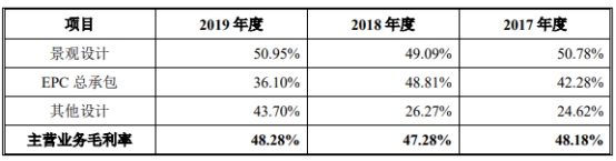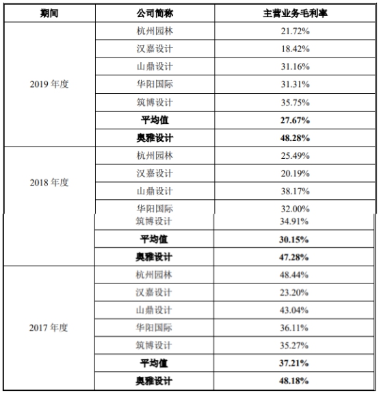 与同行业上市公司相比,奥雅设计主营业务综合毛利率处于较高水平。2017年-2019年,公司主营业务综合毛利率分别为48.18%、47.28%和48.28%,同行业可比上市公司同期主营业务综合毛利率的平均值分别为37.21%、30.15%和27.67%。