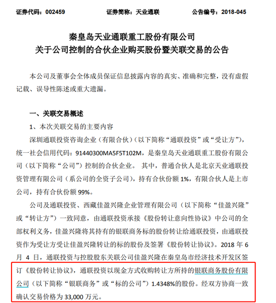 另一笔交易则是在2018年6月,秦皇岛天业通联重工股份有限公司控制的合伙企业通联投资与控股股东关联公司佳盈兴隆在秦皇岛市经济技术开发区签订《股份转让协议》,通联投资以现金方式收购转让方所持的银联商务股份有限公司1.4348%的股份。经双方协商一致确认交易价格为 33,000 万元。以此计算,银联商务的估值在230亿元左右。两次交易估值大体一致。