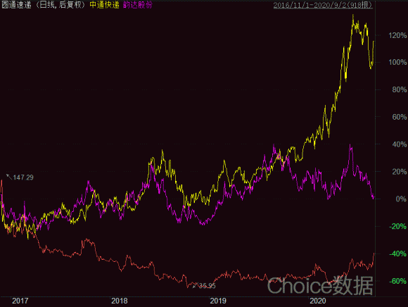 而A股投资者对于炮灰的命运一向非常现实,纷纷选择用脚投票:圆通从2016年年底落后行业之后,股价最多跌幅高达60%,而确定行业头名位置的中通股价则一路绝尘。