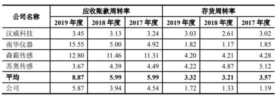 上述同期,四方光电的存货周转率1.19次、1.72次、1.33次,均低于行业可比上市公司平均水平3.57次、3.21次和3.32次。