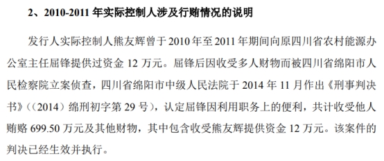 公司实际控制人熊友辉早年间涉一起行贿事项,熊友辉曾于2010年至2011年期间向原四川省农村能源办公室主任屈锋提供过资金12万元。