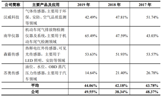 而可比上市公司的主营业务毛利率均值分别为43.78%、42.18%和44.06%,总体上低于四方光电。