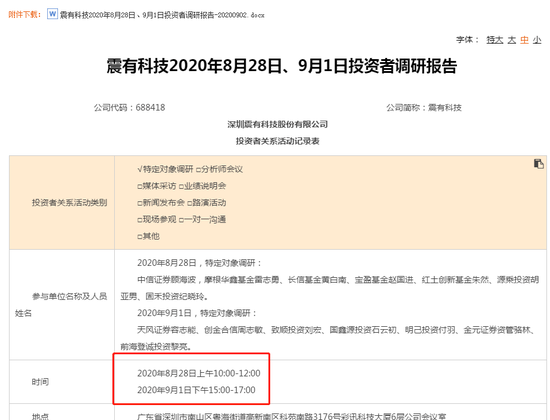 据披露,8月28日、9月1日,包括中信证券、摩根华鑫基金等14家券商、公募、私募机构投资者,密集造访震有科技。