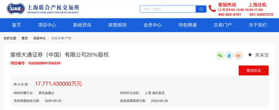 2020年9月2日晚间,上海联合产权交易所挂出摩根大通证券20%股权,转让价格为1.78亿元,并要求一次性付款。以今年5月31日为评估基准日,摩根大通证券转让标的对应评估值为1.73亿元,挂牌价格相对评估值溢价仅2.89%。