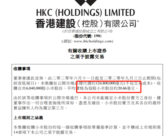 香港建设(00190)宣布,由2020年6月11日起至2020年9月3日止期间集团在公开市场以总代价约1.25亿港元,收购合共604万股小米(01810)股份,平均价格为每股约20.66港元。