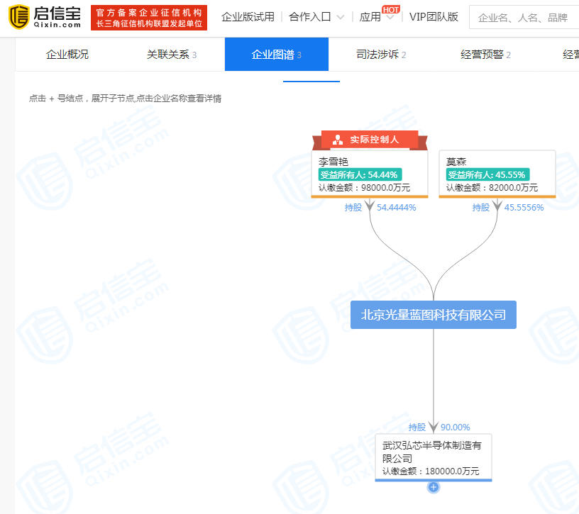 曾经光环加身的武汉弘芯为何会走到如今的境地,大股东方面又有何打算?启信宝显示,武汉弘芯大股东为北京光量蓝图科技有限公司(以下简称北京光量),其持股比例为90%。而北京光量股东为李雪艳、莫森两名自然人,持股比例分别为54.44%和45.56%。从公开资料来看,北京光量并无相关行业背景。