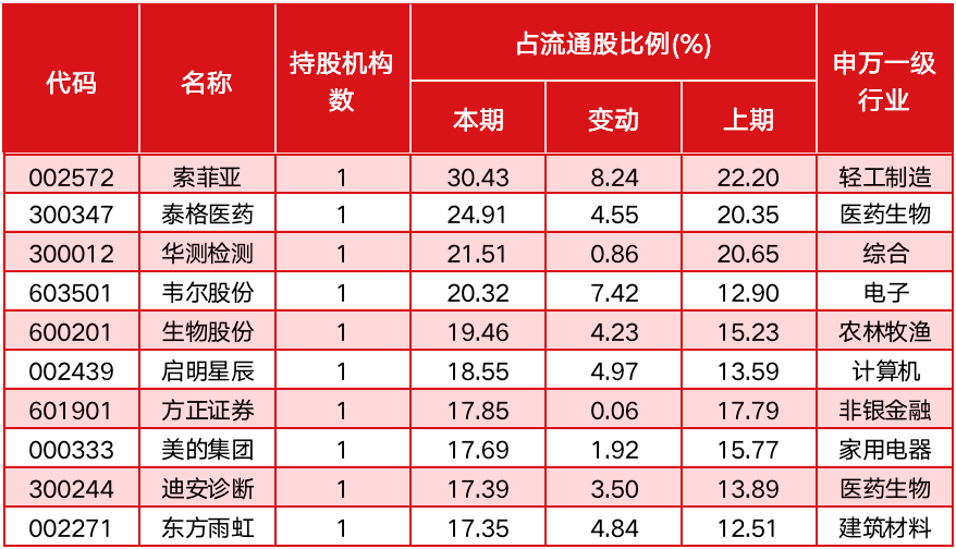 除了QFII,陆股通也是观察外资动向的一大窗口。从中报情况看,从陆股通加仓公司的角度,占流通股比例正向变动的公司中,当期排名前10名的公司为索菲亚、泰格医药、华测检测、韦尔股份、生物股份、启明星辰、方正证券、美的集团、迪安诊断、东方雨虹。其中索菲亚陆股通当期持股比例达到30.43%,居于首位,占流通股比例提升了8.24%。从这些公司所属行业看,集中度不如QFII高,但延续了QFII对行业龙头的高度认可。