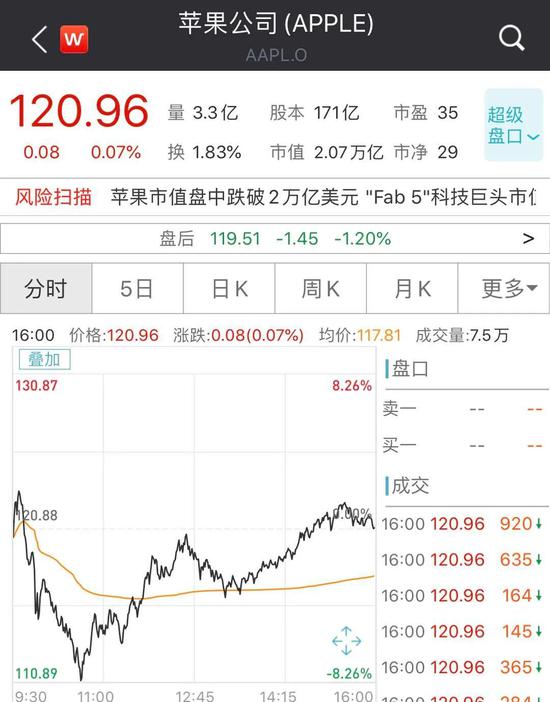 科技股集体盘中暴跌,苹果一度跌超8%,但收盘翻红,微涨0.07%。