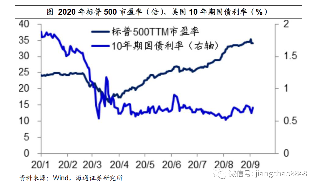 但是到目前为止,即便经过上周的大幅调整之后,美股今年以来的表现依然非常突出,纳斯达克指数比去年末上涨26.1%,标普500指数也比去年末上涨6.1%。经济严重衰退而股市大幅上涨,这意味着美股上涨主要依靠的是估值水平的大幅提升。由于美联储重启零利率和量化宽松,推动10年期美债利率从年初的1.9%大幅降至1%以下,进而推动标普500市盈率从年初的25倍升至目前的34倍,远超历史平均市盈率的16倍,在过去的120年中仅有两年的年末市盈率高于当前水平。