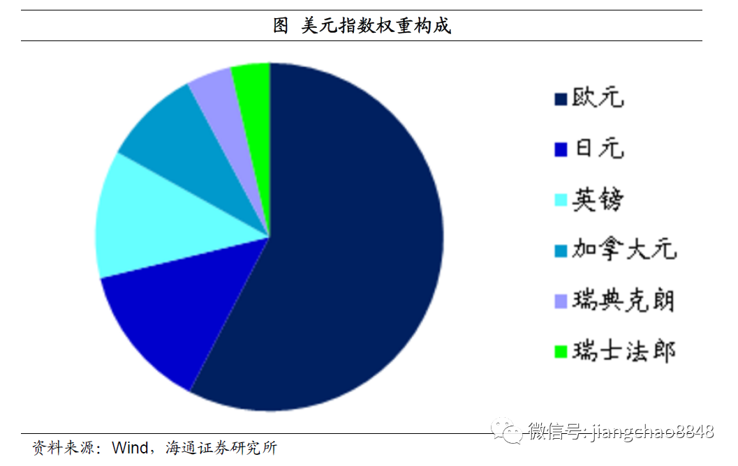 美元指数主要是由美元对6大货币的汇率加权平均而成,其中欧元的占比高达57.6%,这意味着美元兑欧元汇率对美元指数的影响最大。