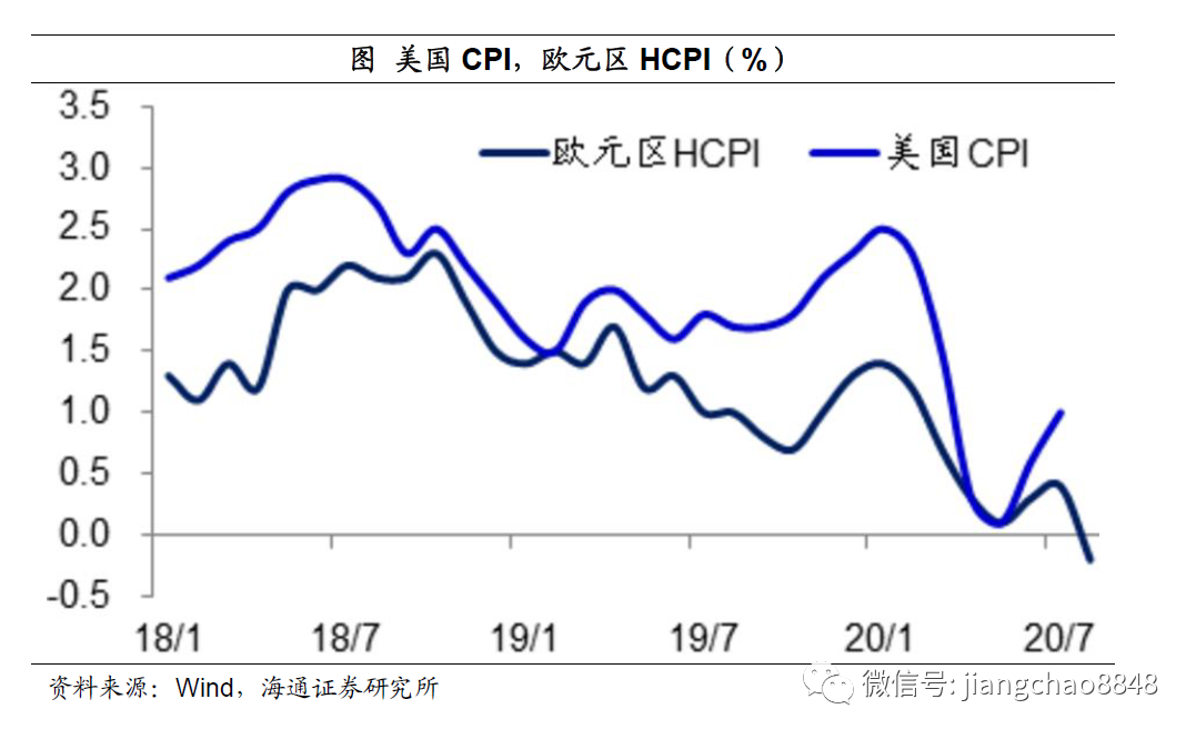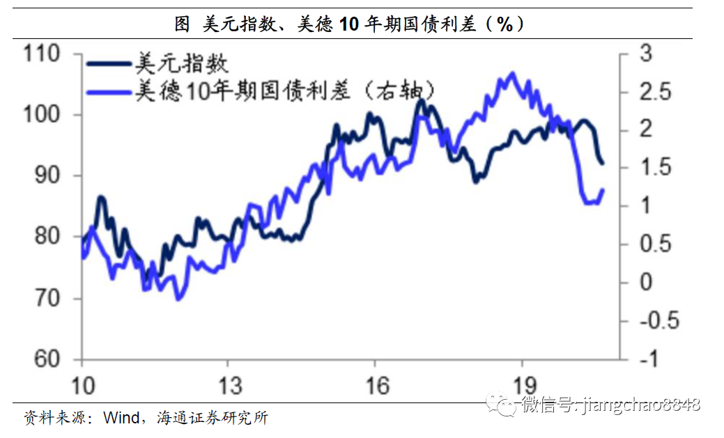 我们认为,导致2季度以来美元贬值最重要的原因应是利率的变化,由于美国重启零利率和量化宽松,使得美国10年期国债利率大幅下降。而欧元区由于触及零负利率的边界,无法进一步降息,同期核心国德国的10年期国债利率基本维持不变,这就使得美德国债利差大幅缩窄,从而推动了美元对欧元贬值。