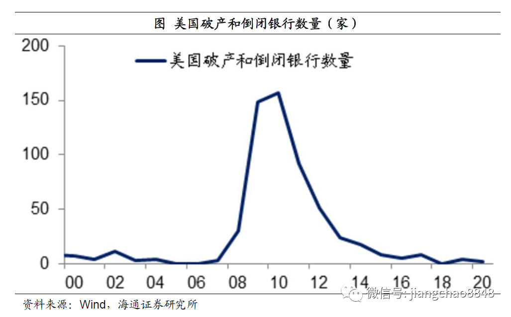 例如在08年次贷危机的过程中,我们可以看到美国破产和倒闭的银行数量大幅上升,在2008年有30家,到2009/2010两年都接近150家。然而在这一次的新冠疫情期间,到目前为止美国只有两家银行倒闭被接管,这意味着美国的金融体系几乎完好无损。