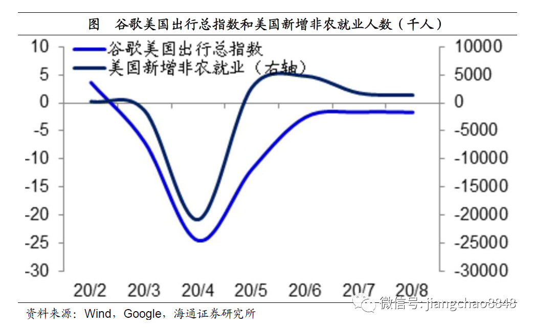 但这一次的经济和就业损失之所以出现,在于疫情导致了居家隔离,大家无法出门工作消费。而在疫情缓解之后,随着人群重新出门,其实就业和经济就回来了。谷歌的数据显示,美国出行冻结最严重的是4月份,当月共减少了2100万个工作机会。而在5月份以后居民出行持续改善,同时在过去的4个月美国已经恢复了1060万个工作机会。