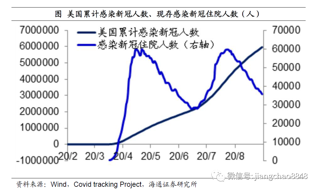 虽然美国感染新冠的人数还在继续上升,但由于医疗水平的进步,大部分感染者都可以康复,目前还在住院的感染者大幅减少,说明新冠占用的医疗资源也在持续下降。因此,目前虽然还没有有效的疫苗出现,但新冠的影响其实是在持续大幅减弱。