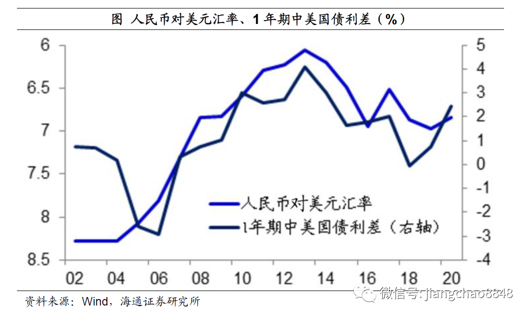 影响人民币对美元汇率的另一因素是中美利差。今年以来1年期中美利差从去年末的77bp扩大至246bp,这也是近期人民币对美元大幅升值的重要原因。