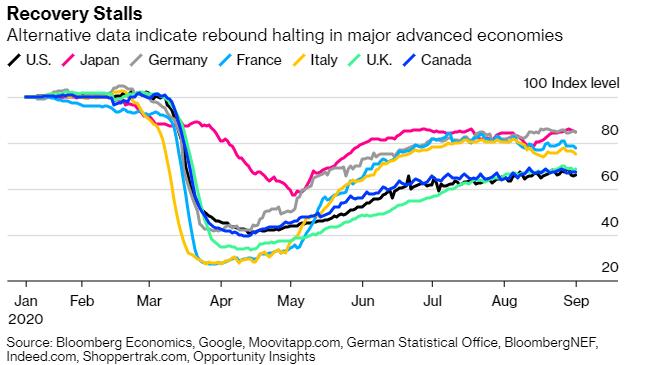在欧洲,衡量经济活动的指标正在下降,由于需求疲软和价格下跌挤压了利润率,工厂正试图削减成本。尽管法国和德国延长了休假计划,但英国计划在10月份终止其休假计划,这可能使数以百万计的工作面临风险。