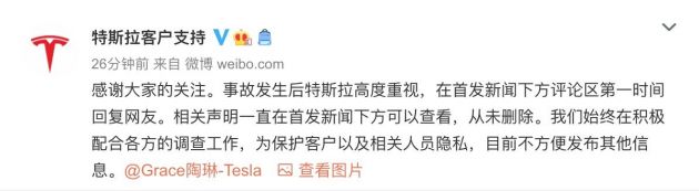 发生车祸5小时后,特斯拉官方微博发表声明,称根据对车辆数据的分析显示车辆没有发生故障,会尽全力配合警方的调查工作。随后,有网友称,该回应微博被删除。